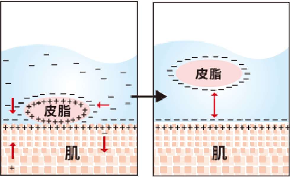皮脂と肌を引き離し、反発を利用した剥離現象を生み出し、表面から汚れや余分な皮脂をきれいに洗い落とします。